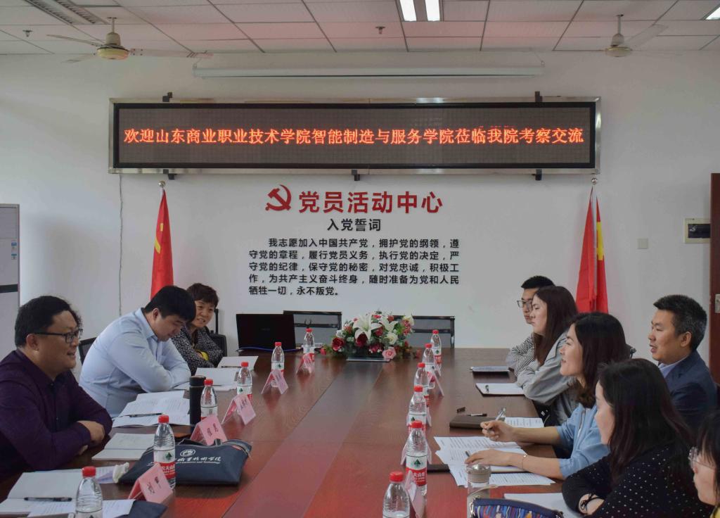 4月10日上午9点,山东商业职业技术学院智能制造与服务学院一行六人来我院考察交流。我院党总支书记王丽、组织员王怀建以及全体学工成员参加了座谈会。